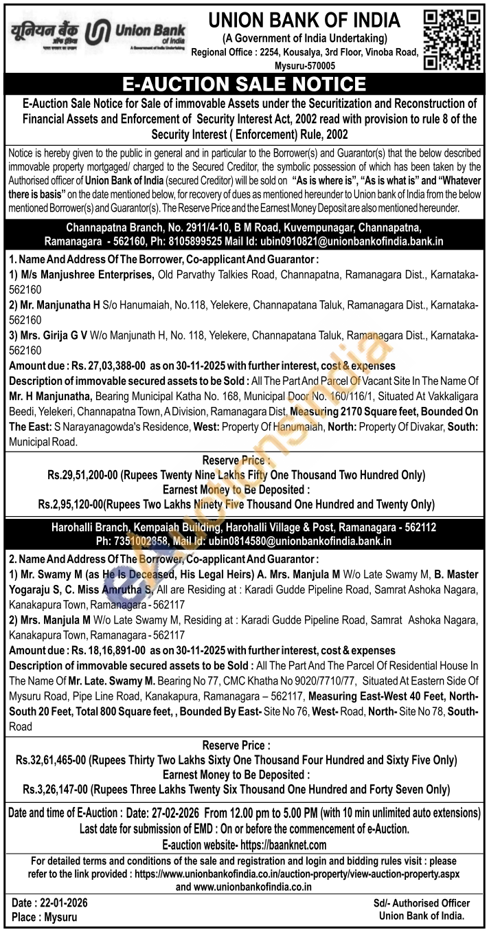 Description of immovable secured assets to be Sold: All The Part And Parcel Of Vacant Site In The Name Of Mr. H Manjunatha, Bearing Municipal Katha No. 168, Municipal Door No. 160/116/1, Situated At Vakkaligara Beedi, Yelekeri, Channapatna Town, A Division, Ramanagara Dist, Measuring 2170 Square feet, Bounded On The East: S Narayanagowda's Residence, West: Property Of Hanumaiah, North: Property Of Divakar, South: Municipal Road.