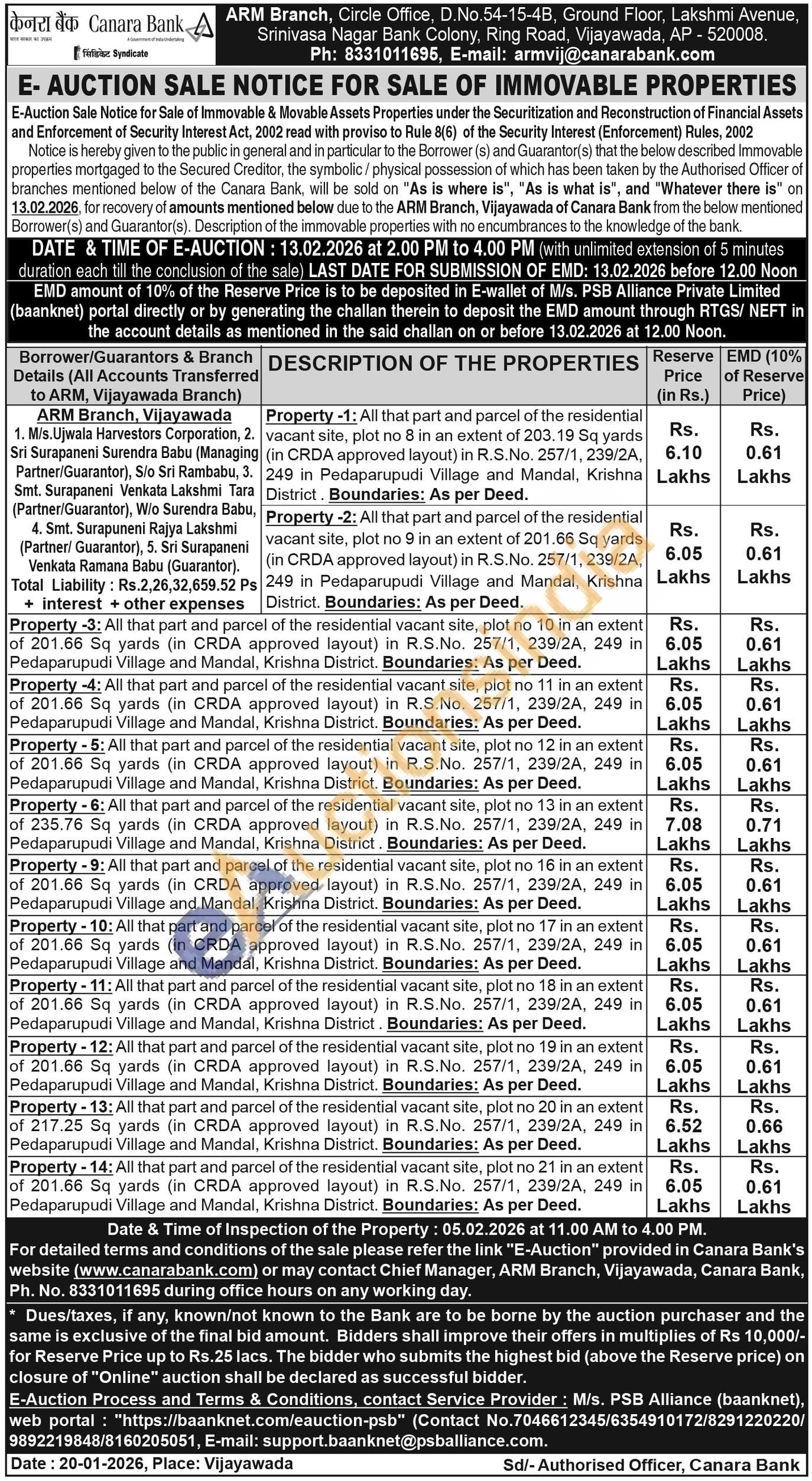 Property -4: All that part and parcel of the residential vacant site, plot no 11 in an extent of 201.66 Sq yards (in CRDA approved layout) in R.S.No. 257/1, 239/2A, 249 in Pedaparupudi Village and Mandal, Krishna District. Boundaries: As per Deed.
