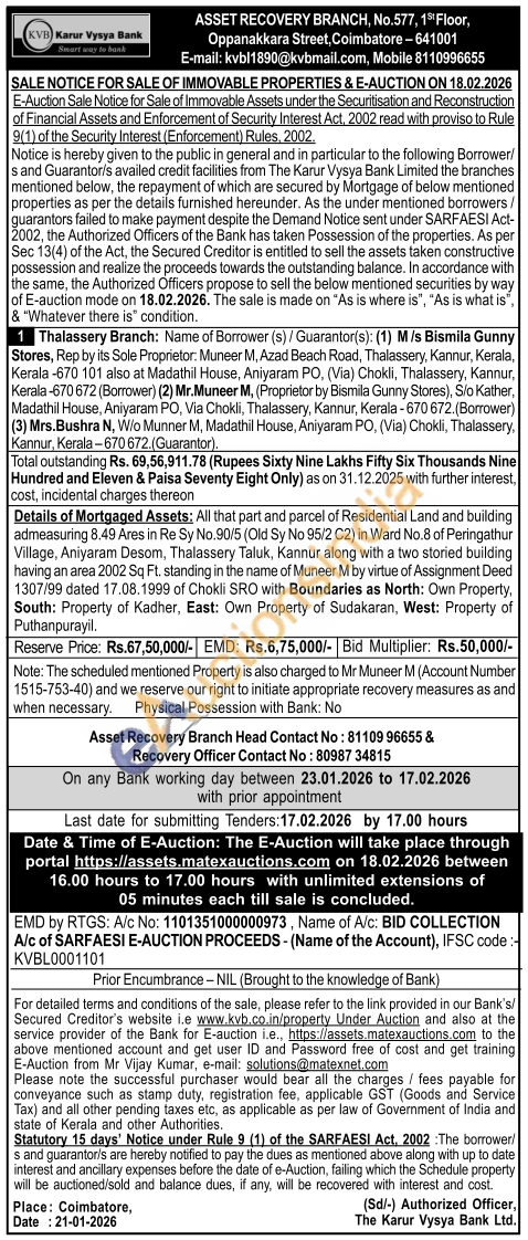 Details of Mortgaged Assets: All that part and parcel of Residential Land and building admeasuring 8,49 Ares in Re Sy No.90/5 (Old Sy No 95/2 C2) in Ward No.8 of Peringathur Village, Aniyaram Desom, Thalassery Taluk, Kannur along with a two storied building having an area 2002 Sq Ft. standing in the name of Muneer M by virtue of Assignment Deed 1307/99 dated 17.08.1999 of Chokli SRO with Boundaries as North: Own Property, South: Property of Kadher, East: Own Property of Sudakaran, West: Property of Puthanpurayil.