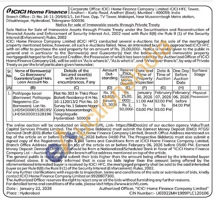 Flat No 303 In Third Floor Baheti Residency-II H No. 16-1120/13/2 Plot No. 10 Survey No. 1 Saleem Nagar Colony Moosarambagh Teegalaguda Hyderabad-500036