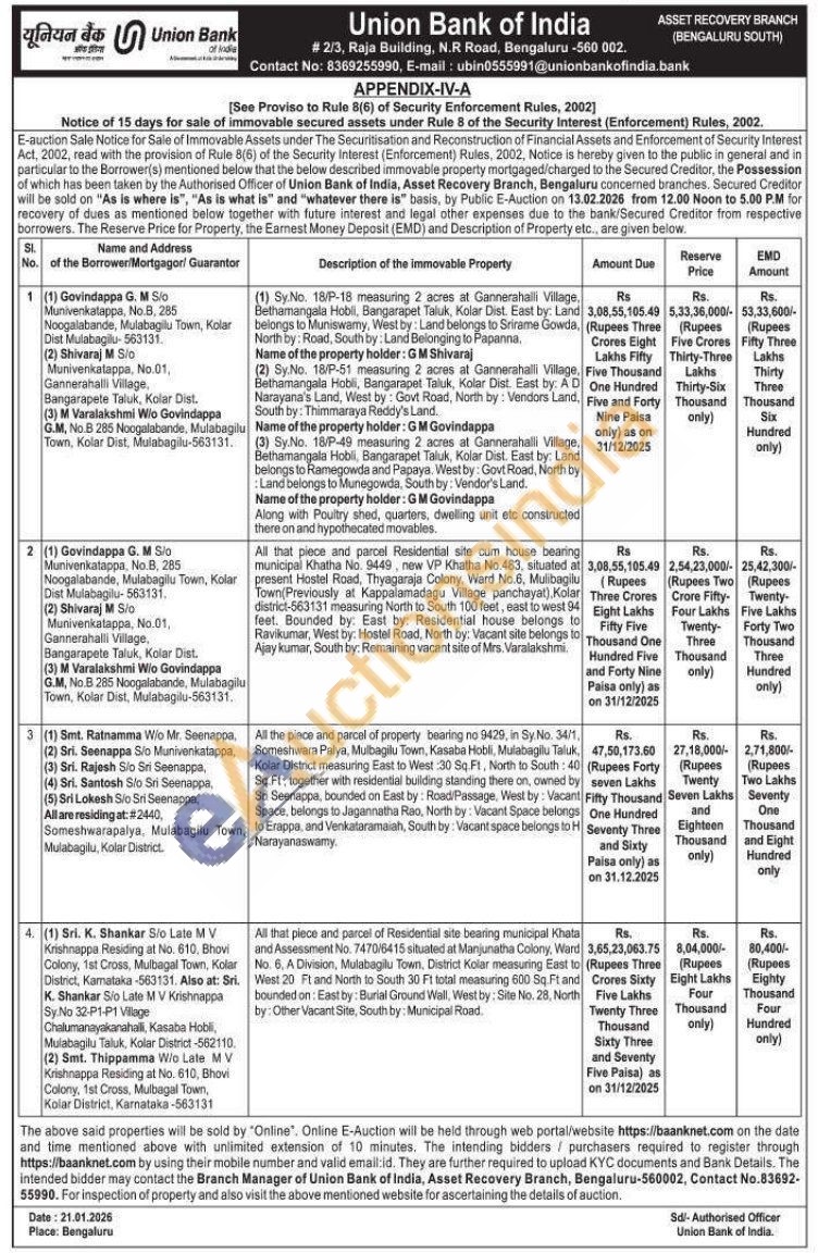 3) All the piece and parcel of property bearing no 9429, in Sy. No. 34/1, Someshwara Palya, Mulbagilu Town, Kasaba Hobli, Mulabagilu Taluk Kolar District measuring East to West :30 Sq Ft, North to South: 40 Sq Ft, together with residential building standing there on, owned by Sri Seenappa, bounded on East by: Road/Passage, West by: Vacant Space, belongs to Jagannatha Rao, North by: Vacant Space belongs to Erappa, and Venkataramaiah, South by: Vacant space belongs to H Narayanaswamy