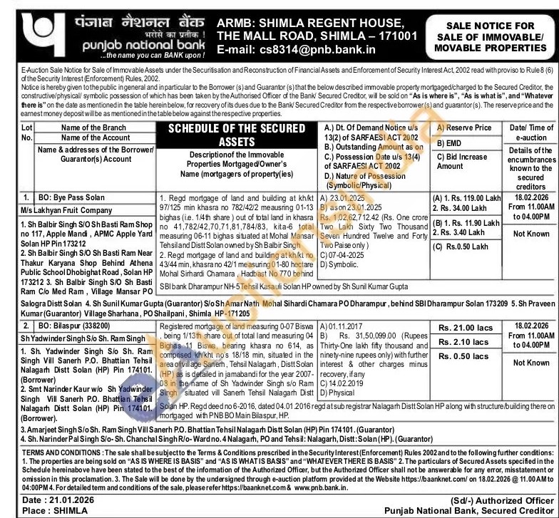 Registered mortgage of land measuring 0-07 Biswa being 1/13th share out of total land measuring 04 Bighas 11 Biswa, bearing khasra no 614, as comprised kh/kht no's 18/18 min, situated in the area of village Sanerh, Tehsil Nalagarh, Distt Solan (HP) as is detailed in jamabandi for the year 2007-08 in the name of Sh Yadwinder Singh s/o Ram Singh situated vill Sanerh Tehsil Nalagarh Distt Solan HP. Regd deed no 6-2016, dated 04.01.2016 regd at sub registrar Nalagarh Distt Solan HP along with structure/building there on mortgaged with PNB BO Main Bilaspur, HP