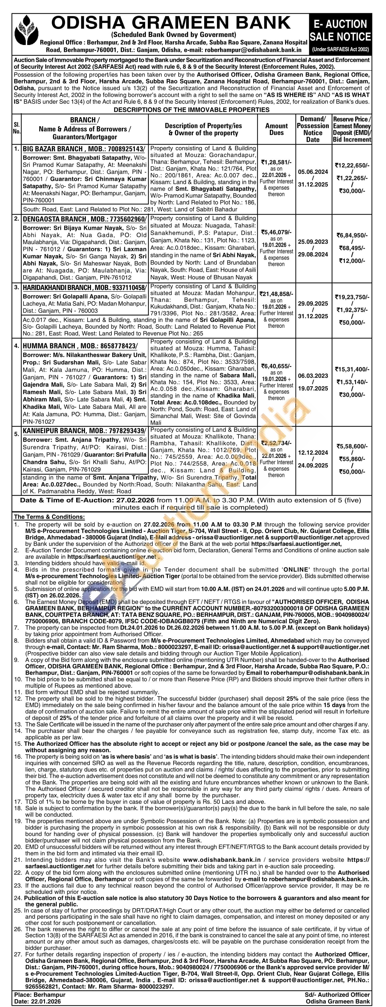 Property consisting of Land & Building situated at Mouza: Khallikote, Thana: Rambha, Tahasil: Khallikote, Dist.: Ganjam, Khata No.: 1012/769, Plot No.: 745/2559, Area: Ac.0.009dec., Plot No.: 744/2558, Area: Ac.0.018 F dec., Kissam: Land & Building.. Tripathy, W/o- Sri Surendra Tripathy, Total , South: Nilakantha Sahu, East: Landstanding in the name of Smt. Anjana Area: Ac.0.027dec., Bounded by North: Road of K. Padmanabha Reddy, West: Road