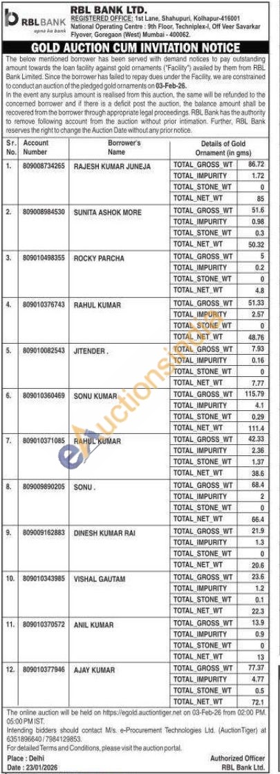 RBL Bank Gold Auctions Auction in New Delhi