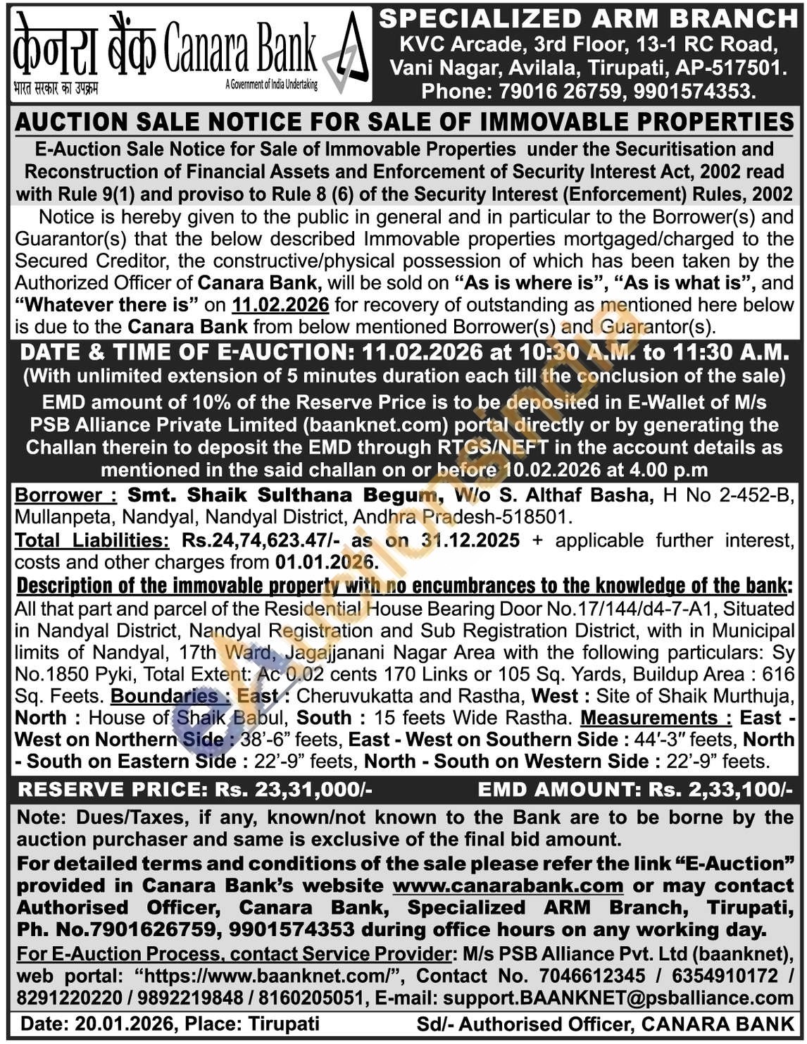 Description of the immovable property with no encumbrances to the knowledge of the bank: All that part and parcel of the Residential House Bearing Door No. 17/144/d4-7-A1, Situated in Nandyal District, Nandyal Registration and Sub Registration District, with in Municipal limits of Nandyal, 17th Ward, Jagajjanani Nagar Area with the following particulars: Sy No.1850 Pyki, Total Extent: Ac 0.02 cents 170 Links or 105 Sq. Yards, Buildup Area: 616 Sq. Feets. Boundaries: East: Cheruvukatta and Rastha, West: Site of Shaik Murthuja, North House of Shaik Babul, South 15 feets Wide Rastha. Measurements: East -West on Northern Side: 38'-6" feets, East - West on Southern Side: 44'-3" feets, North - South on Eastern Side: 22'-9" feets, North-South on Western Side: 22'-9" feets