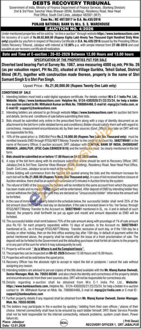 SPECIFICATION OF THE PROPERTIES PUT FOR SALE : Diverted land bearing Part of Survey No. 1067, area measuring 4000 sq.mtr, PH No. 26 (as per valuation report, PH No.25), situated at Village Gurikha, Tehsil Gohad, District Bhind (M.P.), together with construction made thereon, property in the name of Shri Samant Singh S/o Shri Pan Singh