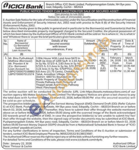 3 Bhk House With Land Area 9470 In Built Up Area of 1200 Sq.ft In 2.43 Ares In Sy No. 572/3-4, 2.83 Ares In Sy No. 572/2-5, 0.3 Ares In Sy No. 570/PT52. 3.24 Ares In Sy No. 570/PT51), Total of 8.8 Ares (21.75 Cents), Chalakkudy Taluk, Annalloor Village, Thrissur District-680731 Bounded On The North: Property of Thoppil Janaki South Private Pathway East: Property of Thoppil Janaki And Private Pathway West Panchayath Road