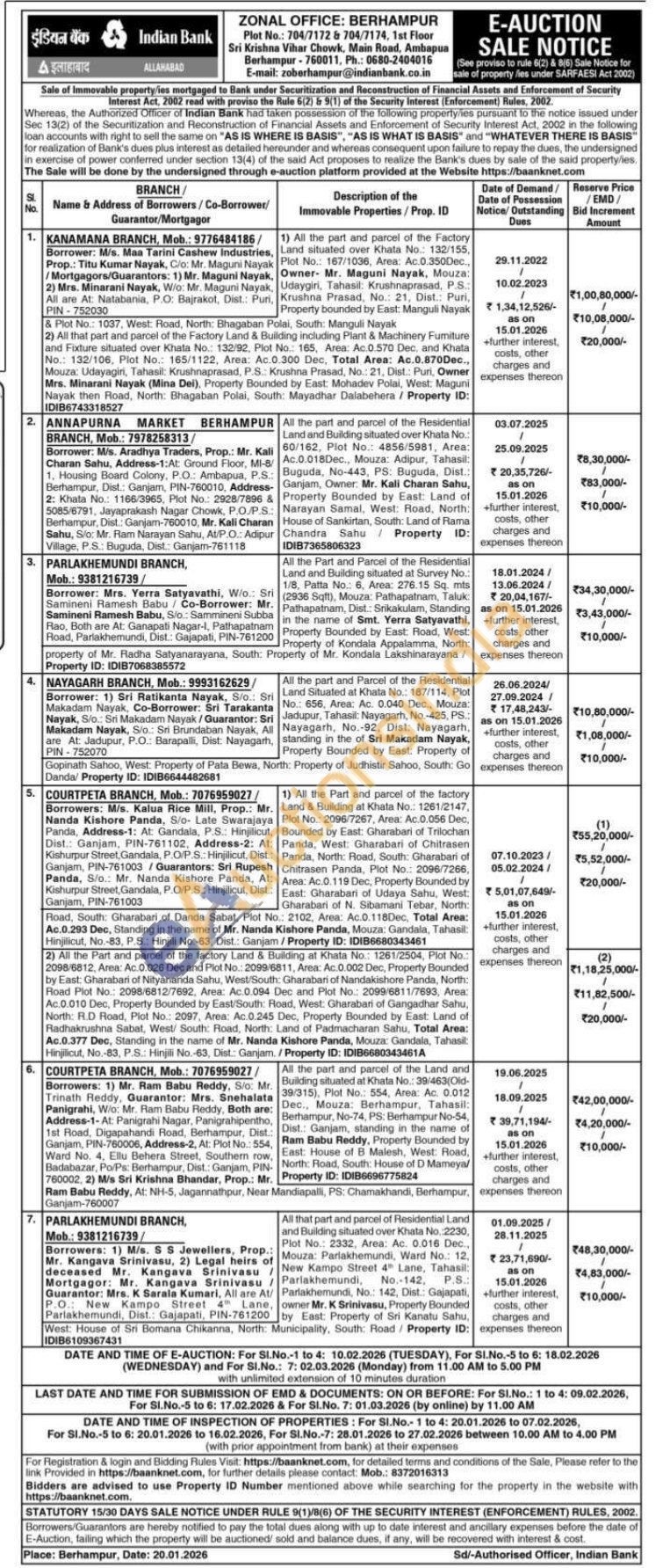 All the part and parcel of the Land and Building situated at Khata No.: 39/463(Old-39/315), Plot No.: 554, Area: Ac. 0.012 Dec., Mouza: Berhampur, Tahasil: Berhampur, No-74, PS: Berhampur No-54, Dist. Ganjam, standing in the name of Ram Babu Reddy, Property Bounded by East: House of B Malesh, West: Road, North: Road, South: House of D Mameya/Property ID: IDIB6696775824