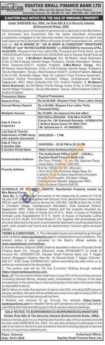 Item No. 1: All that piece and parcel of site measuring an extent of 118.36 Sq.yds or 97.28 sq.mts together with Ground, First, Second Floors measuring 900 sft, each floor Covered by Survey No. 126/182, 126/28 of Door No. 4-330, In Chivatam Village. Undrajavaram Mandalam, East Godavari District, Sajjapuram SRO. West Godavari District and the property bounded by: Boundaries. East: A Site of Ganta Anji 47.9 ft., West: A house of Peddinta Venkata Leela Rajyalakshmi 47.9 ft North A House of Kompella Lalitha Kumari 22.6 ft. South: 33 ft Wide Road 21.3 ft. Together with all buildings and structure attached to the earth or permanently fastened to anything attached to earth, both present and future and all easementary/ mamool rights annexed thereto