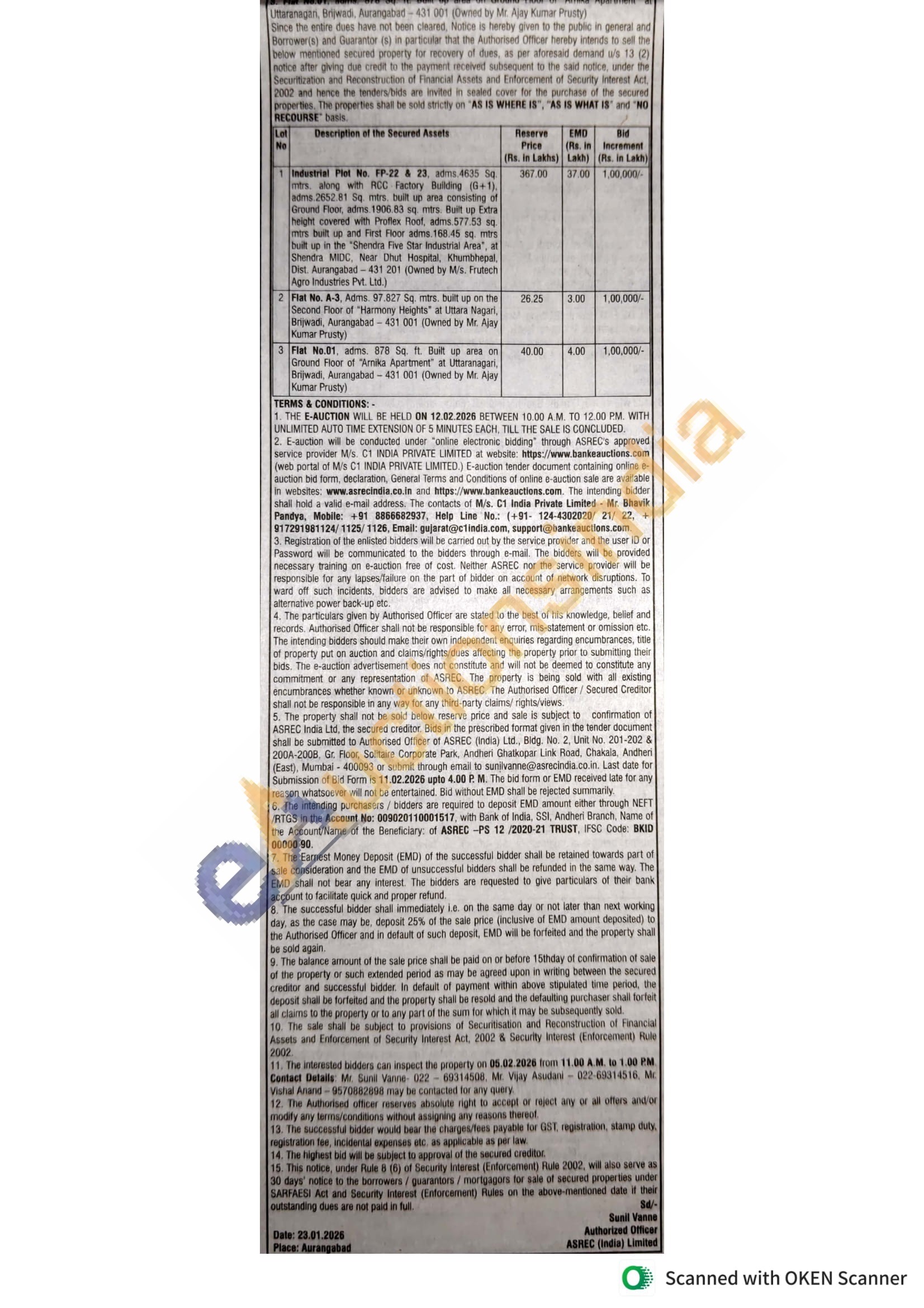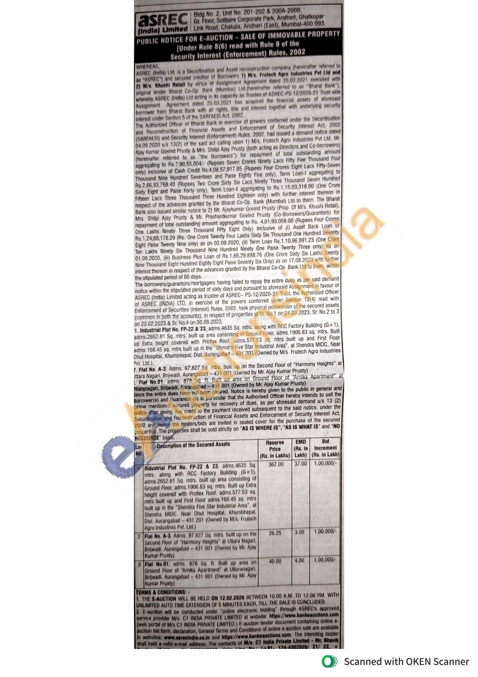 Industrial Plot No. FP-22 & 23, adms.4635 Sq. mtrs. along with RCC Factory Building (G+1), adms.2652.81 Sq. mtrs. built up area consisting of Ground Floor, adms. 1906.83 sq. mtrs. Built up Extra height covered with Proflex Roof, adms.577.53 sq. mtrs built up and First Floor adms.168.45 sq. mtrs built up in the "Shendra Five Star Industrial Area", at Shendra MIDC, Near Dhut Hospital, Khumbhepal, Dist. Aurangabad-431 201 (Owned by M/s. Frutech Agro Industries Pvt. Ltd.)