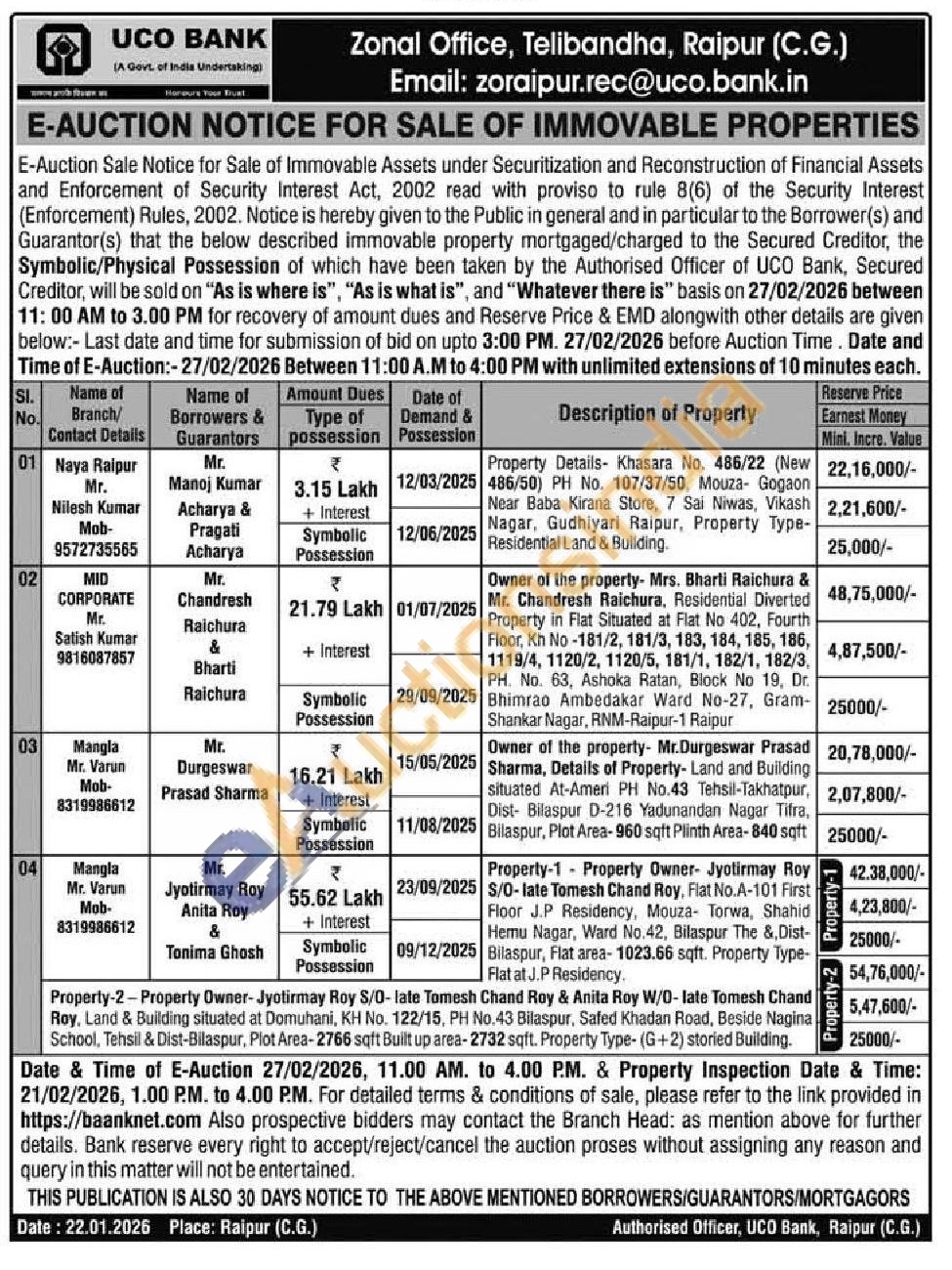 Sharma, Details of Property- Land and Building Owner of the property- Mr.Durgeswar Prasad situated At-Ameri PH No.43 Tehsil-Takhatpur, Dist- Bilaspur D-216 Yadunandan Nagar Tifra, Bilaspur, Plot Area-960 sqft Plinth Area-840 sqft