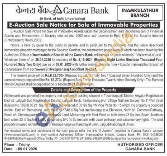 All the parts and parcel of the property and residential building situated in Tiruchirappalli District, Ariyalur Registration District, Lalgudi Sub Registration District, Lalgudi Taluk, Keelaperungavur Village Natham Survey No. 11/Part (Sub division No. 188/3) 50.21. Sq.mtr (540% Sq. feet) out of 00199 Sq.mtr Vide Patta No. 15 which the property is bounded on the East of: Remaining Land, West of: 540% Sq.feet land belongs to A. Ebinesan, North of: Common Pathway, South of: Chinnappan wife Karuththiranai Land, Measuring with East-West on both sides 23 Sq. feet, South-North on both sides 23 16 Sq.feet totally comprising 540% Sq feet site with usual pathway and easementary rights. The said property situated within the limits of Keelaperungavur Panchayat Limit, Lalgudi Panchayat Union.