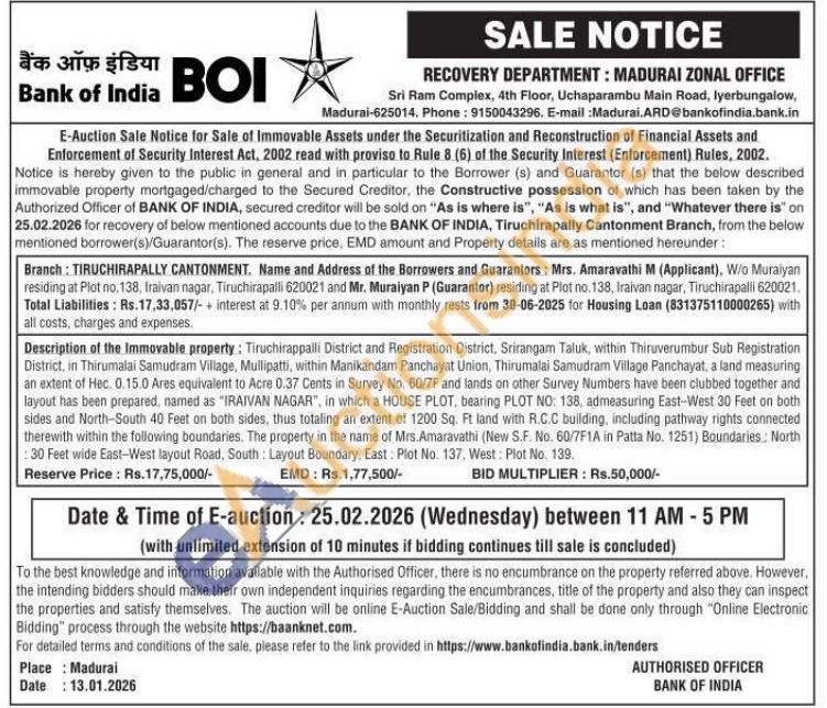 Description of the Immovable property: Tiruchirappalli District and Registration District, Srirangam Taluk, within Thiruverumbur Sub Registration District, in Thirumalai Samudram Village, Mullipatti, within Manikandam Panchayat Union, Thirumalai Samudram Village Panchayat, a land measuring an extent of Hec. 0.15.0 Ares equivalent to Acre 0.37 Cents in Survey No. 60/7F and lands on other Survey Numbers have been clubbed together and layout has been prepared, named as "IRAIVAN NAGAR", in which a HOUSE PLOT, bearing PLOT NO: 138, admeasuring East-West 30 Feet on both sides and North-South 40 Feet on both sides, thus totaling an extent of 1200 Sq. Ft land with R.C.C building, including pathway rights connected therewith within the following boundaries. The property in the name of Mrs. Amaravathi (New S.F. No. 60/7F1A in Patta No. 1251) Boundaries: North :30 Feet wide East-West layout Road, South: Layout Boundary, East. Plot No. 137. West: Plot No. 139.