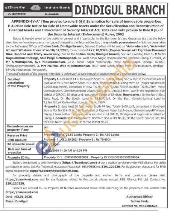 Property 1. East West 14 feet, North South 40 Va feet, totally 587 4 sq.ft in the eastern side of East West 29 V feet, North South 40 feet, along with the building there on (as per sub division 0.0055.0sq.meter), comprised in New T.S.No14 old TS.No. 730/4A1A,older TS.No. 730/4, West Govindapuram, Chettinackenpatti Village, Ward No.1, Dindigul Town, with in the registration sub district of ISRO II, Dindigul and registration district of Dindigul. Boundaries: On the North East West Road, On the South: Land in T.S. No730/4, On the East: Kamatchiammal Land in T.S.No. 730./4, On the West: Land in T.S.No. 730/4.
