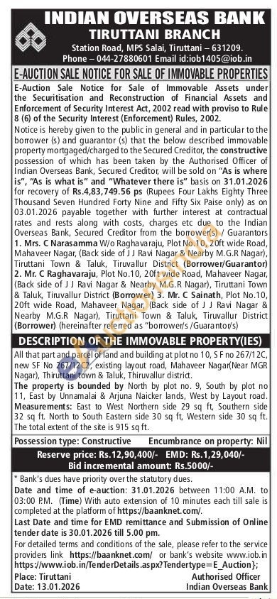 All that part and parcel of land and building at plot no 10, SF no 267/12C, new SF No 267/12C2, existing layout road, Mahaveer Nagar(Near MGR Nagar), Thiruttani town & Taluk, Thiruvallur district. The property is bounded by North by plot no. 9, South by plot no 11, East by Unnamalai & Arjuna Naicker lands, West by Layout road. Measurements: East to West Northern side 29 sq ft, Southern side 32 sq ft. North to South Eastern side 30 sq ft, Western side 30 sq ft. The total extent of the site is 915 sq ft.
