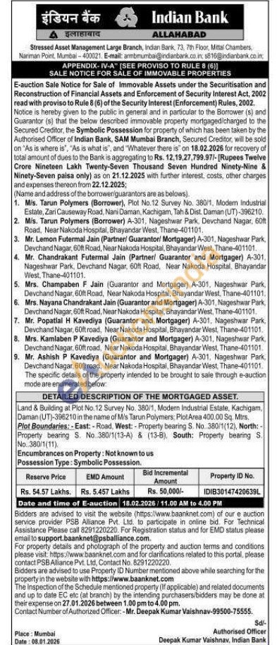 Land & Building at Plot No 12 Survey No. 380/1, Modern Industrial Estate, Kachigam, Daman (UT)-396210 in the name of M/s Tarun Polymers: Plot Area 400.00 Sq. Mirs. Plot Boundaries: - East: Road, West: -Property bearing S. No. 380/1(12), North: Property bearing S. No. 380/1(13-A) & (13-8), South: Property bearing S. No.380/1(11) Encumbrances on Property: Not known to us Possession Type: Symbolic Possession.