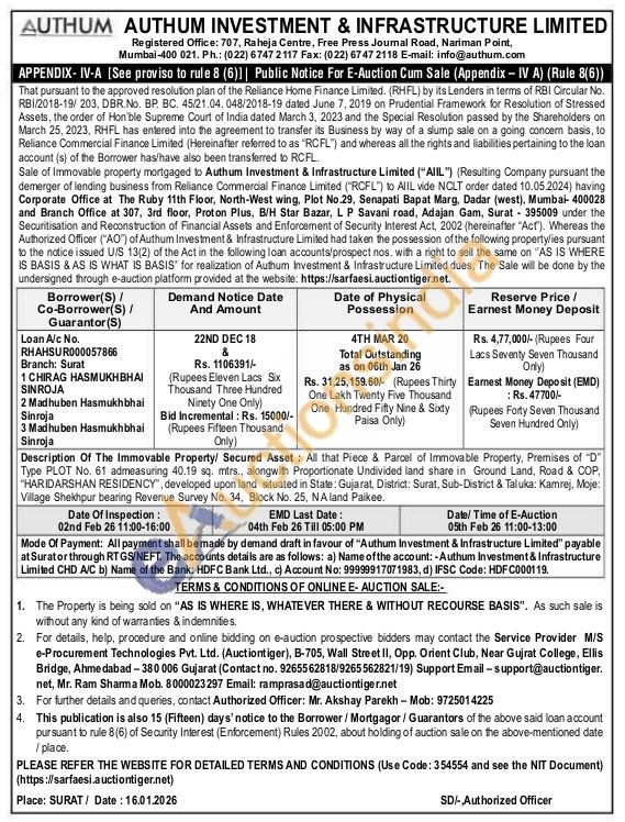 Description Of The Immovable Property/ Secured Asset: All that Piece & Parcel of Immovable Property, Premises of "D" Type PLOT No. 61 admeasuring 40.19 sq. mtrs., alongwith Proportionate Undivided land share in Ground Land, Road & COP, "HARIDARSHAN RESIDENCY", developed upon land situated in State: Gujarat, District: Surat, Sub-District & Taluka: Kamrej, Moje: Village Shekhpur bearing Revenue Survey No. 34, Block No. 25, NA land Paikee.