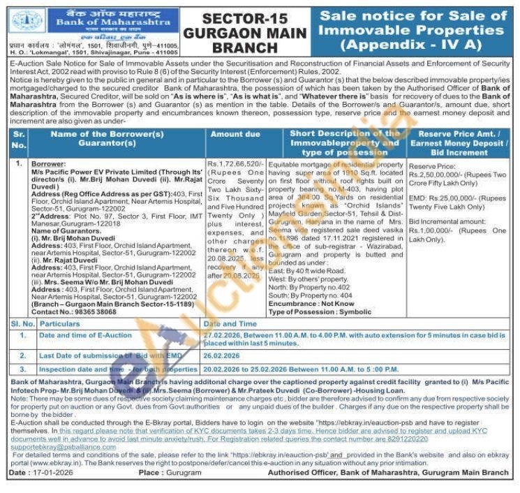 Equitable mortgage of residential property having super area of 1910 Sq.ft. located on first floor without roof rights built on property bearing no.M-403, having plot area of 364.00 Sq Yards on residential projects known as "Orchid Islands Mayfield Garden, Sector-51, Tehsil & Dist-Gurugram, Haryana in the name of Mrs. Seema vide registered sale deed vasika no 11896 dated 17.11.2021 registered in the office of sub-registrar Wazirabad, Gurugram and property is butted and bounded as under:East: By 40 ft wide Road, West: By others property. North: By Property no. 402 South: By Property no. 404 Encumbrance: Not Know