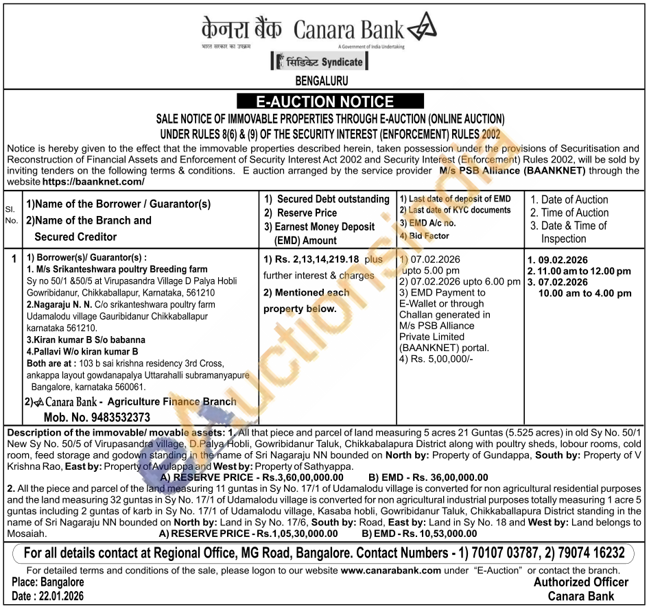 Description of the immovable/ movable assets: 1. All that piece and parcel of land measuring 5 acres 21 Guntas (5.525 acres) in old Sy No. 50/1 New Sy No. 50/5 of Virupasandra village, D.Palya Hobli, Gowribidanur Taluk, Chikkabalapura District along with poultry sheds, lobour rooms, cold room, feed storage and godown standing in the name of Sri Nagaraju NN bounded on North by: Property of Gundappa, South by: Property of V Krishna Rao, East by: Property of Avulappa and West by: Property of Sathyappa.