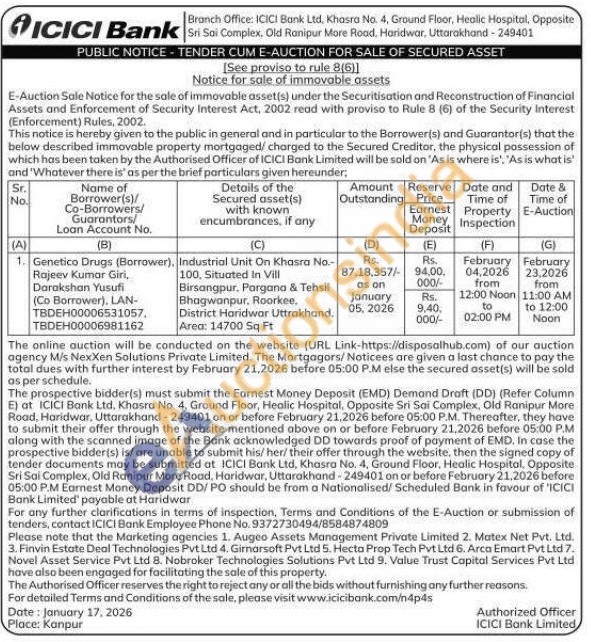 Industrial Unit On Khasra No.-100, Situated in Vill Birsangpur. Pargana & Tehsil Bhagwanpur, Roorkee. District Haridwar Uttrakhand.Area: 14700 Sq Ft