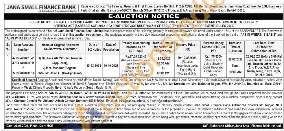 Details of Secured Assets: Residential House No. 1688 (Entire Double Storey), Gali No.31, Out of Khasra No.3488, Khata No.01841, Area Measuring 40 Sq.yards Covered Area 80 Sq.yards, situated at Ashok Vihar Colony, Near Lal School, Village Loni, Ghaziabad, Tehsil & Pargana Loni, District Ghaziabad. Owned by Mr. Jakir Ali, S/o. Mr. Nuradin and Mrs. Maharun Begum, W/o. Mr. Jakir Ali. Bounded as: East: Other's Property, West: Other's Property, North: Other's Property, South: Rasta 15 Ft.