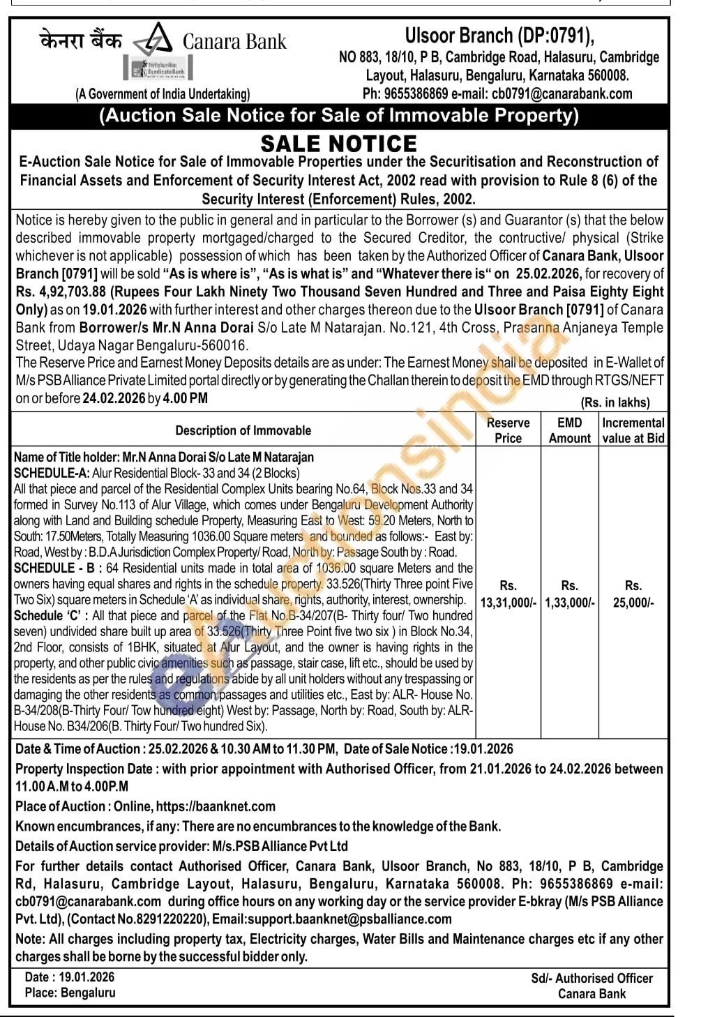 Name of Title holder: Mr.N Anna Dorai S/o Late M Natarajan SCHEDULE-A: Alur Residential Block-33 and 34 (2 Blocks) All that piece and parcel of the Residential Complex Units bearing No.64, Block Nos.33 and 34 formed in Survey No.113 of Alur Village, which comes under Bengaluru Development Authority along with Land and Building schedule Property, Measuring East to West: 59.20 Meters, North to South: 17.50Meters, Totally Measuring 1036.00 Square meters and bounded as follows:- East by: Road, West by: B.D.A Jurisdiction Complex Property/Road, North by: Passage South by: Road. SCHEDULEB: 64 Residential units made in total area of 1036.00 square Meters and the owners having equal shares and rights in the schedule property. 33.526 (Thirty Three point Five Two Six) square meters in Schedule 'A' as individual share, rights, authority, interest, ownership. Schedule 'C': All that piece and parcel of the Flat No.B-34/207(B- Thirty four/ Two hundred seven) undivided share built up area of 33.526(Thirty Three Point five two six) in Block No.34, 2nd Floor, consists of 1BHK, situated at Alur Layout, and the owner is having rights in the property, and other public civic amenities such as passage, stair case, lift etc., should be used by the residents as per the rules and regulations abide by all unit holders without any trespassing or damaging the other residents as common passages and utilities etc., East by: ALR- House No. B-34/208(B-Thirty Four/ Tow hundred eight) West by: Passage, North by: Road, South by: ALR-House No. B34/206(B. Thirty Four/ Two hundred Six).