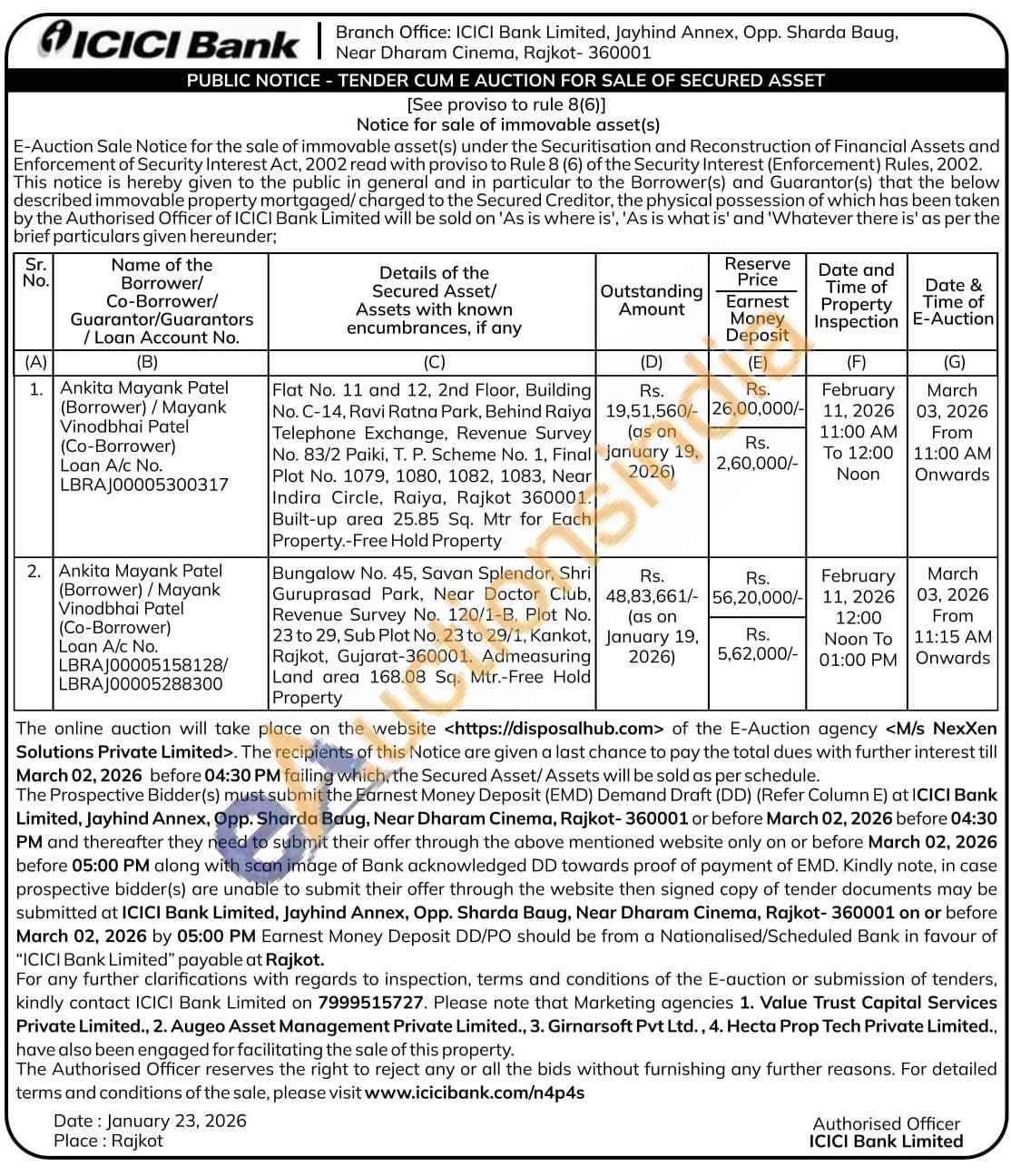 Bungalow No. 45, Savan Splendor, Shri Guruprasad Park, Near Doctor Club, Revenue Survey No. 120/1-B, Plot No. 23 to 29, Sub Plot No. 23 to 29/1, Kankot, Rajkot, Gujarat-360001. Admeasuring Land area 168.08 Sq. Mtr.-Free Hold Property
