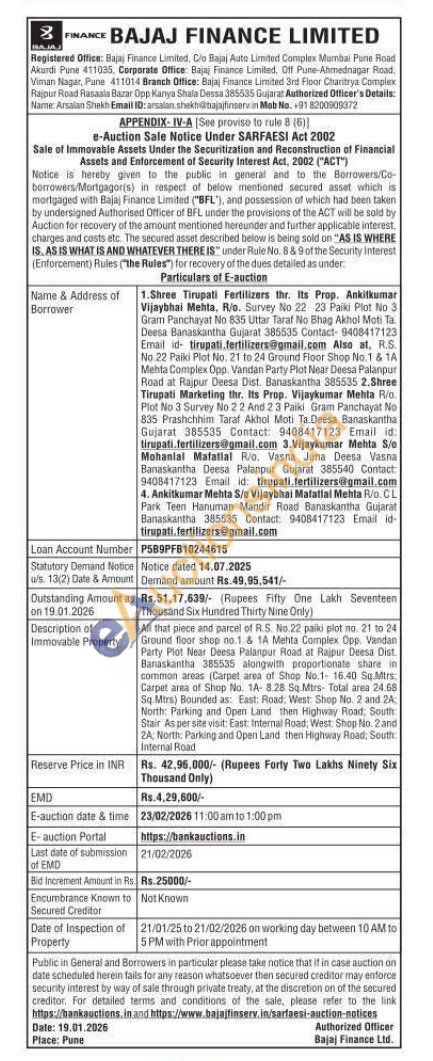 All that piece and parcel of RS. No.22 paiki plot no. 21 to 24 Ground floor shop no.1 & 1A Mehta Complex Opp. Vandan Party Plot Near Deesa Palanpur Road at Rajpur Deesa Dist Banaskantha 385535 alongwith proportionate share in common areas (Carpet area of Shop No.1-16.40 Sq.Mrs Carpet area of Shop No. 1A- 8.28 Sq.Mirs Total area 24.68 Sq.Mtrs) Bounded as: East: Road, West: Shop No. 2 and 24 North: Parking and Open Land then Highway Road, South Stair As per site visit: East: Internal Road: West: Shop No. 2 and 2A: North: Parking and Open Land then Highway Road, South Internal Road