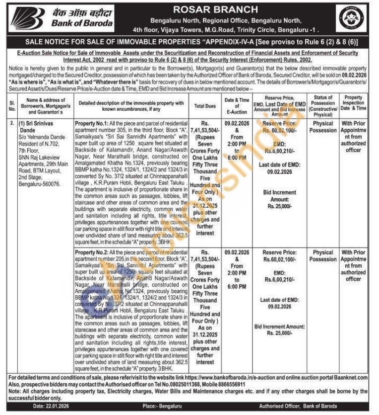 Property No.2: All the piece and parcel of residential apartment number 205 in the second floor, Block "A", Samaikyaa's 'Sri Sai Sannidhi Apartments with super built up area of 1250 square feet situated at Backside of Kalamandir, Anand Nagar/Aswath Nagar, Near Marathalli bridge, constructed on Amalgamated Khatha No.1324, previously bearing BBMP katha No. 1324, 1324/1, 1324/2 and 1324/3 in converted Sy No. 37/2 situated at Chinnappanahalli village, K.R.Puram Hobli, Bengaluru East Taluku The apartment is inclusive of proportionate share in the common areas such as passages, lobbies, lift starecase and other areas of common area and the buildings with separate electricity, common water and sanitation including all rights, title interest, privileges appurtenances together with one covered car parking space in stilt floor with right title and interest over undivided share of land measuring about 362.5 square feet, in the schedule "A" property. 3 BHK