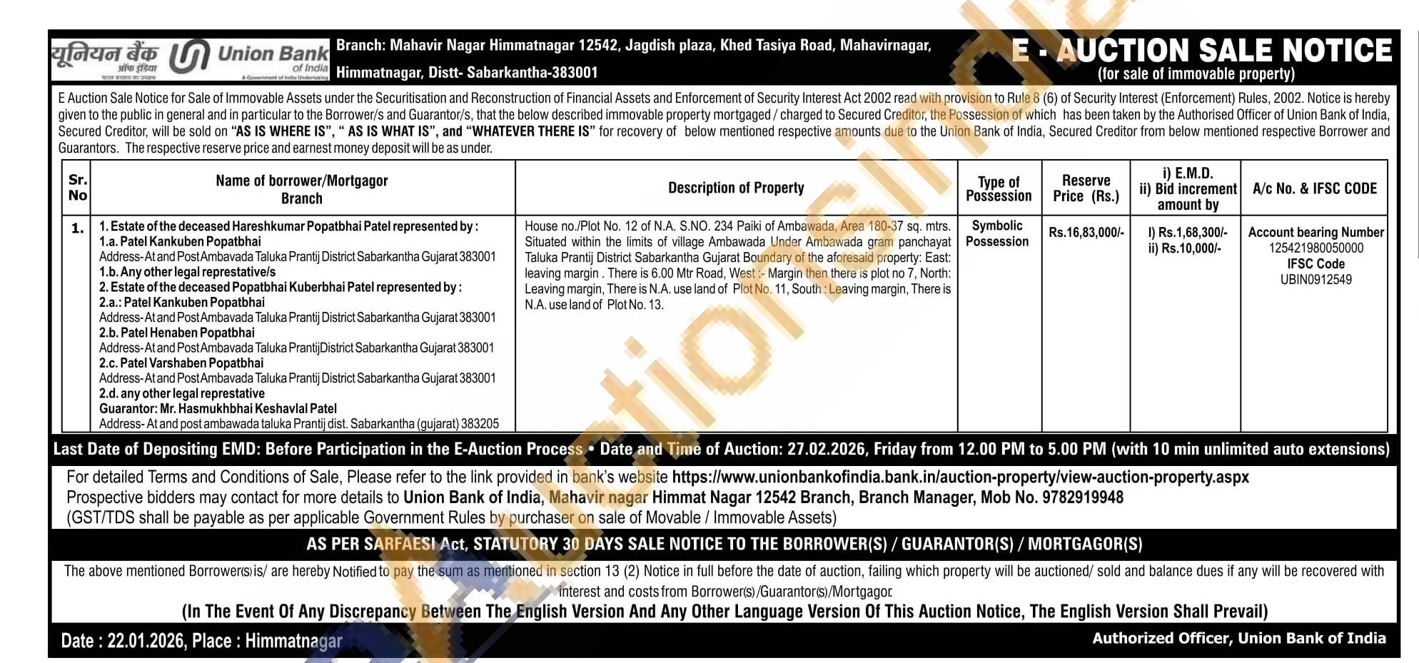 House no/Plot No. 12 of N.A. S.NO. 234 Paiki of Ambawada, Area 180-37 sq. mtrs. Situated within the limits of village Ambawada Under Ambawada gram panchayat Taluka Pranti District Sabarkantha Gujarat Boundary of the aforesaid property. East: leaving margin. There is 6.00 Mtr Road, West:- Margin then there is plot no 7, North: Leaving margin, There is N.A. use land of Plot No. 11, South Leaving margin. There is N.A. use land of Plol No. 13.