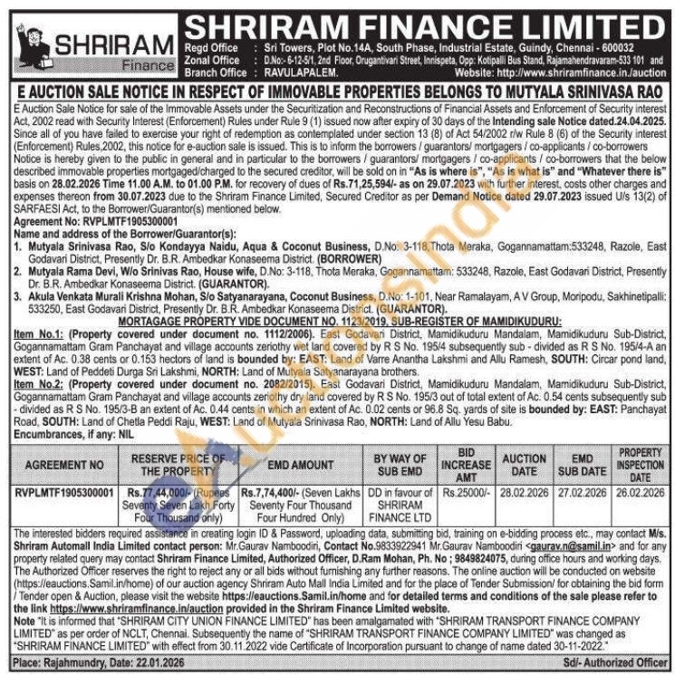 Item No.1: (Property covered under document no. 1112/2006). East Godavari District, Mamidikuduru Mandalam, Mamidikuduru Sub-District, Gogannamattam Gram Panchayat and village accounts zeriothy wet land covered by RS No. 195/4 subsequently sub-divided as R S No. 195/4-A an extent of Ac. 0.38 cents or 0.153 hectors of land is bounded by: EAST: Land of Varre Anantha Lakshmi and Allu Ramesh, SOUTH: Circar pond land, WEST: Land of Peddeti Durga Sri Lakshmi, NORTH: Land of Mutyala Satyanarayana brothers. Item No.2: (Property covered under document no. 2082/2015). East Godavari District, Mamidikuduru Mandalam, Mamidikuduru Sub-District, Gogannamattam Gram Panchayat and village accounts zeriothy dry land covered by R S No. 195/3 out of total extent of Ac. 0.54 cents subsequently sub -divided as R S No. 195/3-B an extent of Ac. 0.44 cents in which an extent of Ac. 0.02 cents or 96.8 Sq. yards of site is bounded by: EAST: Panchayat Road, SOUTH: Land of Chetla Peddi Raju, WEST: Land of Mutyala Srinivasa Rao, NORTH: Land of Allu Yesu Babu.