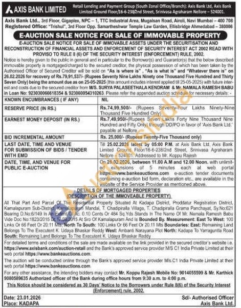 DETAILS OF MORTGAGED PROPERTIES : (DESCRIPTION OF THE IMMOVEABLE PROPERTY) : All That Part And Parcel Of The Residential Property Stuated At Kadapa District, Proddatur Registration District, Kamalapuram Sub-District, Kamalapuram Mandal, T Chadipiralla Vilage, T. Chadipiralla Grama Parichayat, Sy No:621 Bearing D.No:6/149 in An Extent Of Ac 0.10 Cents Or 484 Sq Yds Stands In The Name Of Mr. Namala Ramesh Babu Vide Doc No:1823/2015 Dt: 17.08.2015 At Sro Of Kamalapuram And is Bounded By. Measurement: East To West: 100 Links Or 66 Feet Or 20:11 Mts, North To South: 100 Links Or 66 Feet Or 20.11 Mts Boundaries: East: Remaining Land Belongs To The Executent K. Udaya Bhaskar Reddy West: Ambanti Narayana Plot North: Kadapa To Yarraguntia Road South: Remaining Land Belongs To The Executent K. Udaya Bhaskar Reddy