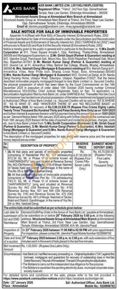 A) All that piece and parcels of immovable properties comprising of Residential Plot No. 173 admeasuring 672.24 Sq. Mt. in Phase VI of scheme known as AANTARKSHITIJ lying and situated at Revenue Survey No. 642 (Old Revenue Survey No. 419) of Mouse: Nasmed of Taluka: Kalol and District Gandhinagar, in the name of You No. 05 ie. Mrs. Nandu Kumari Dangi.