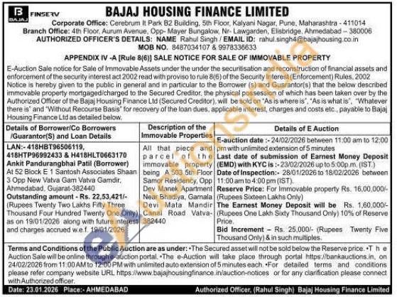 All that piece and parcel of the immovable property being A 503 5th Floor Samor Residency, Opp Dev Manek Apartment Near Bhadiya, Gamala Devi Mata Mandir Canal Road Vatva-382440