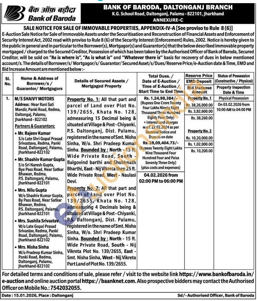 Property No. 1: All that part and parcel of Land over Plot No. 139/2655, Khata No. 128, admeasuring 15 Decimal being & situated at Village & Post-Chiyanki, P.S. Daltonganj, Dist. Palamu, registered in the name of Smt. Nisha Sinha, W/o. Shri Pradeep Kumar Sinha. Bounded by: North - 15 ft. Wide Private Road, South Balgovind barthi and Shobhnath Bharthi, East - Nij Vikreta then 25 ft. Wide Private Road, West - Naulasi Devi