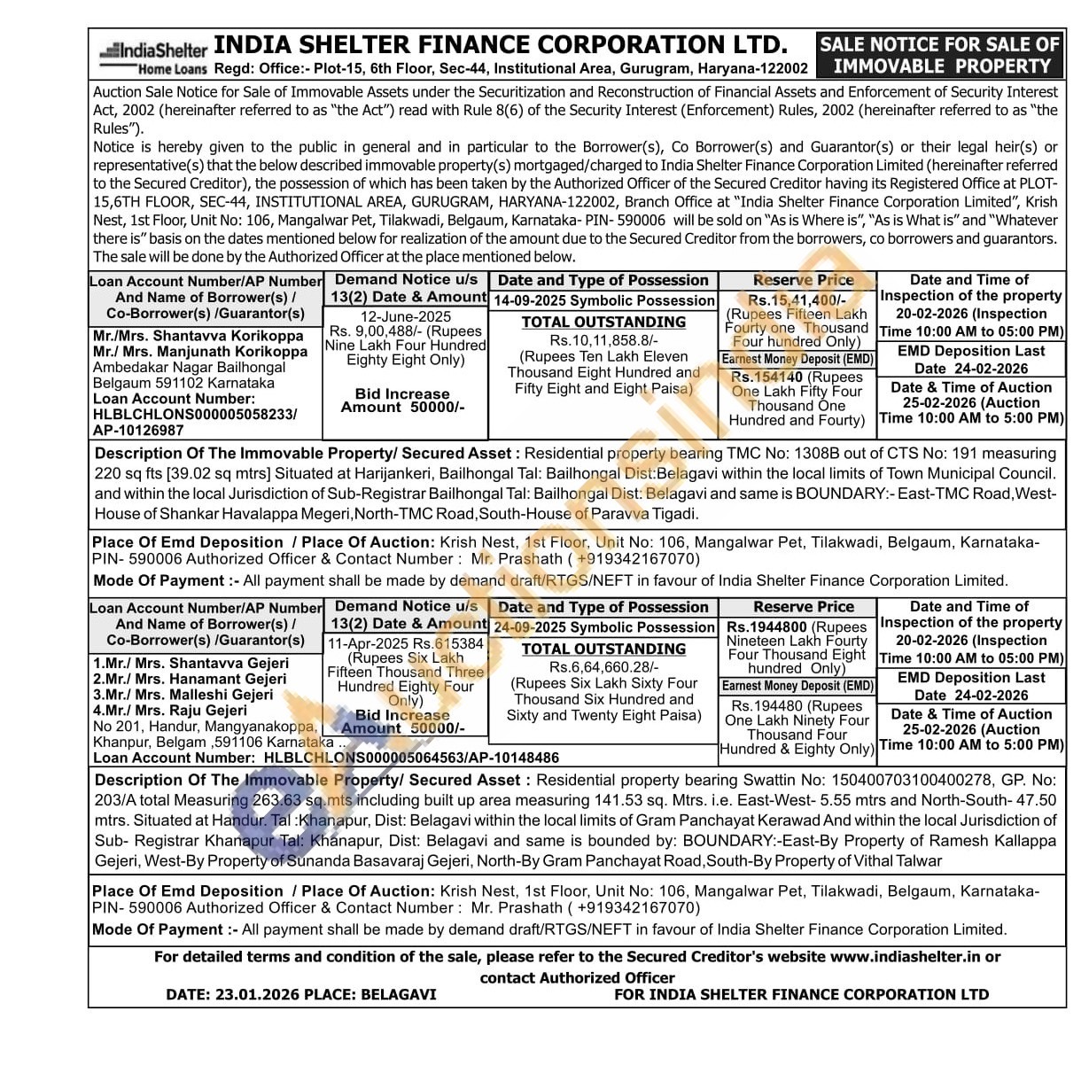 Description Of The Immovable Property/ Secured Asset: Residential property bearing TMC No: 1308B out of CTS No: 191 measuring 220 sq fts [39.02 sq mtrs] Situated at Harijankeri, Bailhongal Tal: Bailhongal Dist: Belagavi within the local limits of Town Municipal Council. and within the local Jurisdiction of Sub-Registrar Bailhongal Tal: Bailhongal Dist: Belagavi and same is BOUNDARY:-East-TMC Road, West-House of Shankar Havalappa Megeri, North-TMC Road, South-House of Paravva Tigadi.