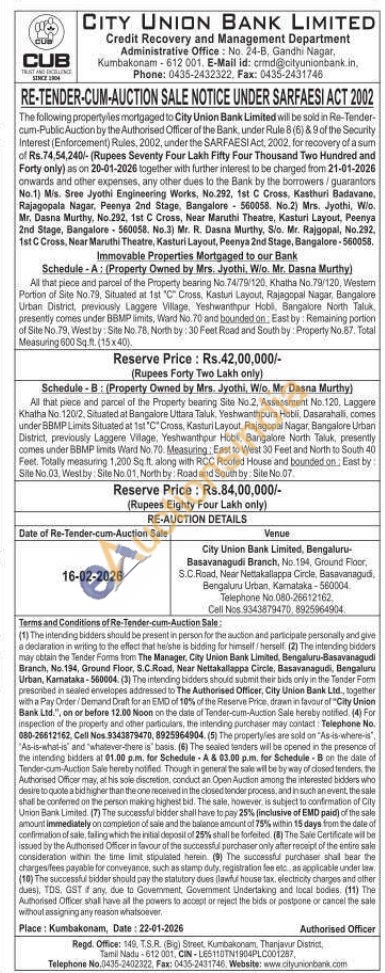 Immovable Properties Mortgaged to our Bank : Schedule-A: (Property Owned by Mrs. Jyothi, W/o. Mr. Dasna Murthy) : All that piece and parcel of the Property bearing No.74/79/120, Khatha No.79/120, Westem Portion of Site No.79, Situated at 1st "C" Cross, Kasturi Layout, Rajagopal Nagar, Bangalore Urban District, previously Laggere Village, Yeshwanthpur Hobil, Bangalore North Taluk, presently comes under BBMP limits, Ward No.70 and bounded on, East by: Remaining portion of Site No.79, West by: Site No.78, North by: 30 Feet Road and South by: Property No.87. Total Measuring 600 Sq.. (15x40)