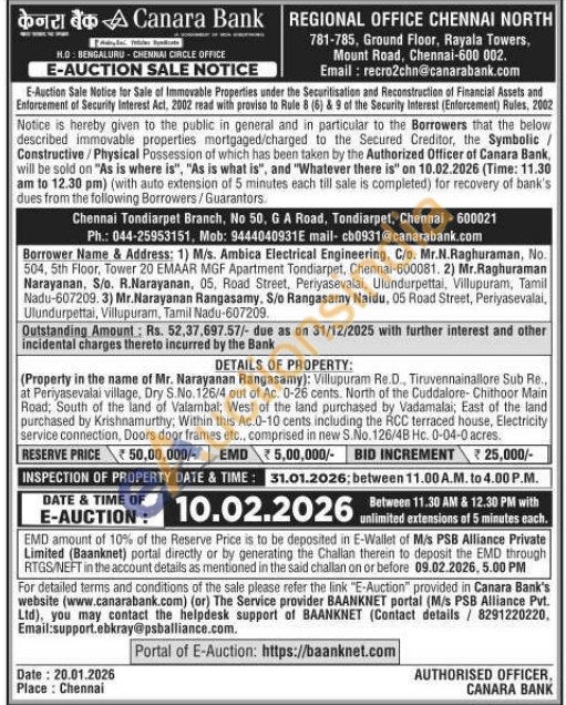 DETAILS OF PROPERTY: (Property in the name of Mr. Narayanan Rangasamy): Villupuram Re.D., Tiruvennainallore Sub Re.. at Periyasevalai village, Dry S.No. 126/4 out of Ac. 0-26 cents. North of the Cuddalore- Chithoor Main Road, South of the land of Valambal, West of the land purchased by Vadamalai; East of the land purchased by Krishnamurthy; Within this Ac.0-10 cents including the RCC terraced house, Electricity service connection, Doors door frames etc., comprised in new S.No. 126/4B Hc. 0-04-0 acres