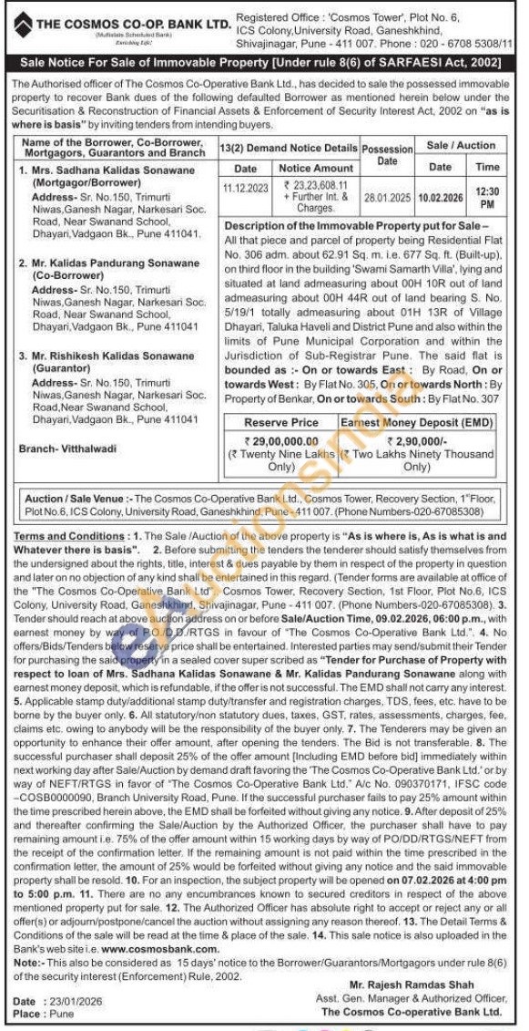 Description of the Immovable Property put for Sale- All that piece and parcel of property being Residential Flat No. 306 adm, about 62.91 Sq. m. i.e. 677 Sq. ft. (Built-up). on third floor in the building 'Swami Samarth Villa', lying and situated at land admeasuring about 00H 10R out of land admeasuring about 00H 44R out of land bearing S. No. 5/19/1 totally admeasuring about 01H 13R of Village Dhayari, Taluka Haveli and District Pune and also within the limits of Pune Municipal Corporation and within the Jurisdiction of Sub-Registrar Pune. The said flat is bounded as: On or towards East: By Road, On or towards West: By Flat No. 305, On or towards North: By Property of Benkar, On or towards South: By Flat No. 307