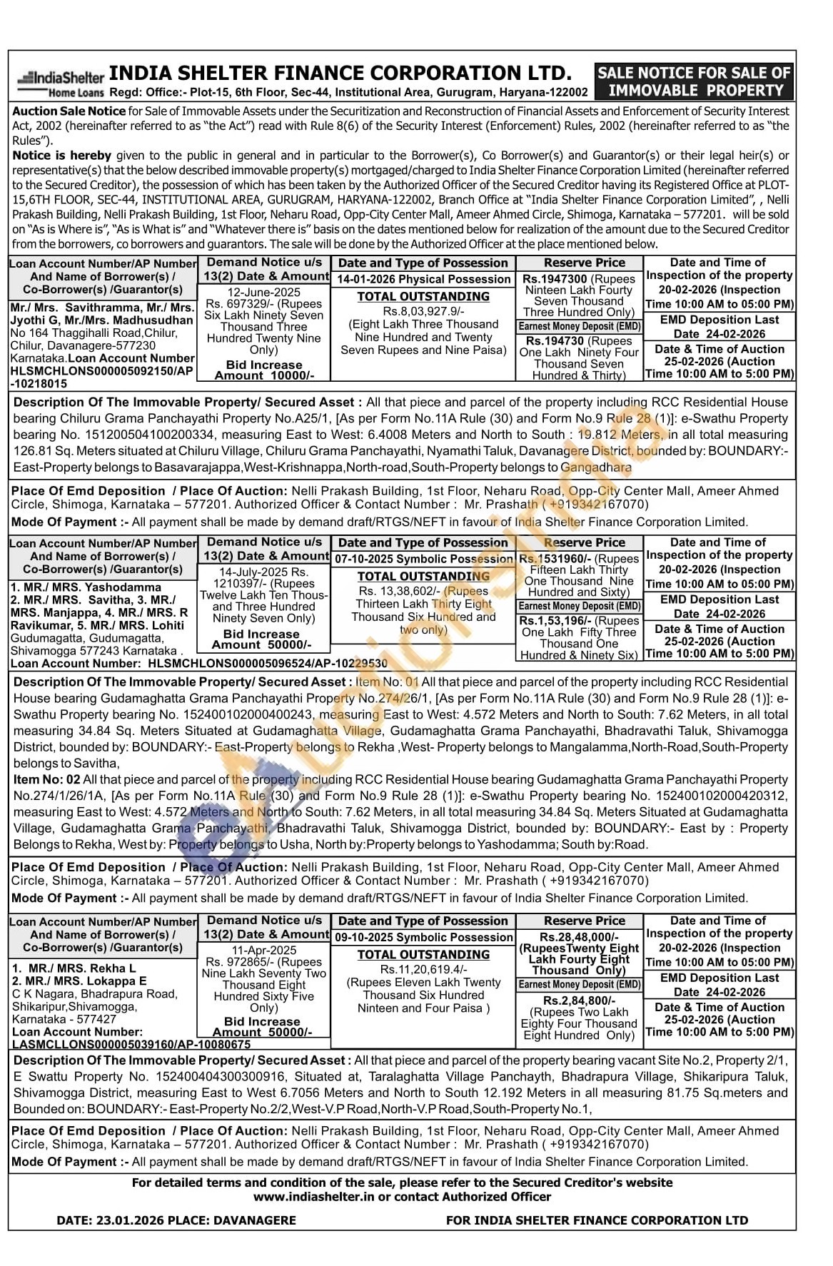 Description Of The Immovable Property/ Secured Asset: All that piece and parcel of the property including RCC Residential House bearing Chiluru Grama Panchayathi Property No.A25/1, [As per Form No. 11A Rule (30) and Form No.9 Rule 28 (1)]: e-Swathu Property bearing No. 151200504100200334, measuring East to West: 6.4008 Meters and North to South 19.812 Meters, in all total measuring 126.81 Sq. Meters situated at Chiluru Village, Chiluru Grama Panchayathi, Nyamathi Taluk, Davanagere District, bounded by: BOUNDARY:-East-Property belongs to Basavarajappa, West-Krishnappa, North-road, South-Property belongs to Gangadhara