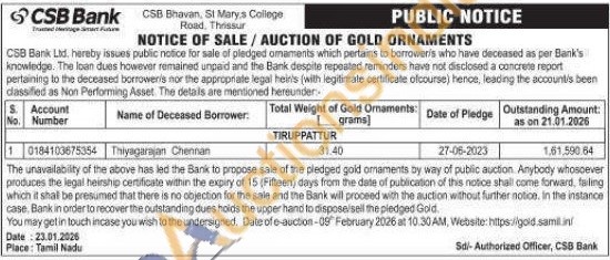 CSB Bank Gold Auctions Auction in Tirupathur