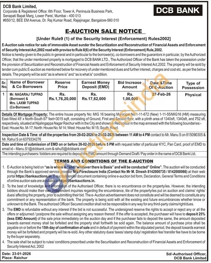 Details Of Mortgage Property: The entire house property No: MIG 16 bearing Municipal No:1-11-672 (New) 1-11-55/MIG16 (HM) measuring East-West 45' x North-South 67' feet-3015 sqft, consisting of Ground, First and Second floor, with a plinth area of 1340sft, 1340sft, and 752 sft, respectively, situated at Nijalingappa Nagar Raichur with in the City and shown in Red colour in the map annexed with the following boundaries:-