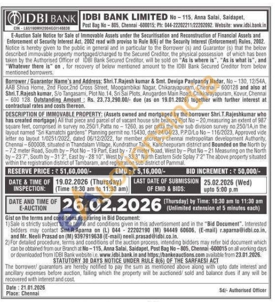 DESCRIPTION OF IMMOVABLE PROPERTY: (Assets owned and mortgaged by the borrower Shri.T.Rajeshkumar who has created mortgage) All that piece and parcel of of vacant house site bearing Plot No-20, measuring an extent of 987 square feet, comprised in survey no.250/1, Patta no1260, as per patta the new sub division survey no 250/1A, in the layout named "Sn Kamatchi gardens Planning permit no. 15430, date 24/04/23, P.P.D/Lo No-116/2023, Approved vide letter no layout 1/0251/2022, dated 06/12/2022, for member secretary chennai metropolitan development Authority, Chennai-600008, situated in Thandalam Village, Kundrathur Taluk, Kancheepuram district and Bounded on the North by -7.2 meter Road, South by-Plot No-19 Part, East by-7.2 meter Road, West by-Plot No-21 Measuring on the North by-23'7", South by-31 2", East by-28 10", West by-33 3" North Eastern Side Splay 7'2" The above property situated within the registration district of Tambaram, and registration sub district of Pammal.
