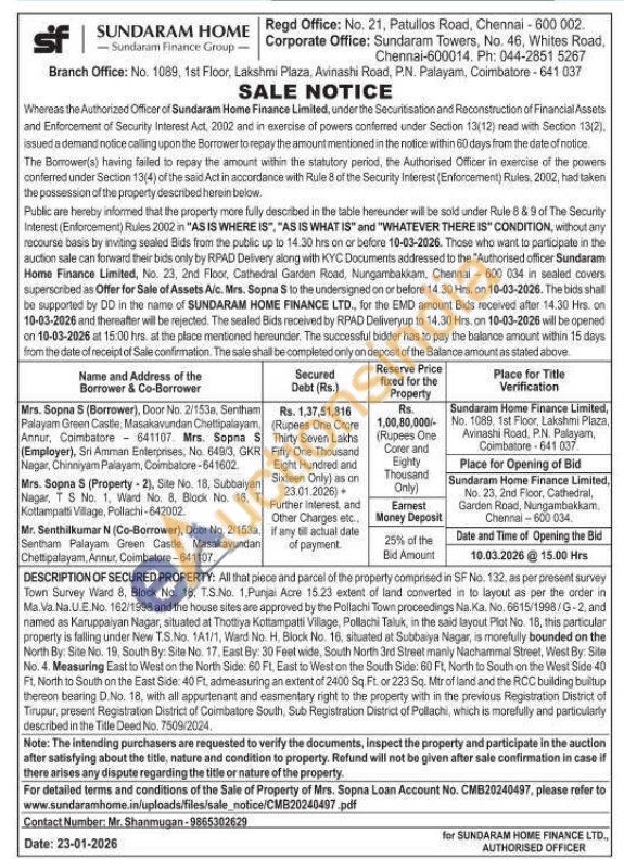 DESCRIPTION OF SECURED PROPERTY: All that piece and parcel of the property comprised in SF No. 132, as per present survey Town Survey Ward 8, Block No. 16, T.S.No. 1, Punja: Acre 15.23 extent of land converted in to layout as per the order in Ma. Va.Na.U.E.No. 162/1998 and the house sites are approved by the Pollachi Town proceedings Na.Ka. No. 6615/1998/G-2, and named as Karuppalyan Nagar, situated at Thottiya Kottampatti Village, Pollachi Taluk, in the said layout Plot No. 18, this particular property is falling under New T.S.No. 1A1/1, Ward No. H. Block No. 16, situated at Subbaiya Nagar, is morefully bounded on the North By: Site No. 19, South By: Site No. 17, East By: 30 Feet wide, South North 3rd Street manly Nachammal Street, West By: Site No. 4. Measuring East to West on the North Side: 60 Ft, East to West on the South Side: 60 Ft, North to South on the West Side 40 Ft. North to South on the East Side: 40 Ft, admeasuring an extent of 2400 Sq. Ft. or 223 Sq. Mtr of land and the RCC building builtup thereon bearing D.No. 18, with all appurtenant and easmentary right to the property with in the previous Registration District of Tirupur, present Registration District of Coimbatore South, Sub Registration District of Pollachi, which is morefully and particularly described in the Title Deed No. 7509/2024