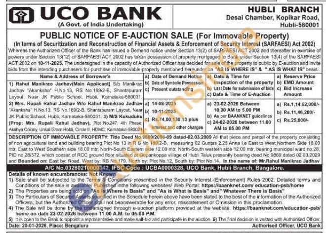 DESCRIPTION OF IMMOVABLE PROPERTY: Title Deed No.9869/2008-09 dated-02.03.2009 All that piece and parcel of the property consisting of non agricultural land and building bearing Plot No 13 in R S No 189/2-B, measuring 02 Guntas 2.25 Anna le East to West Northern Side 18.00 mtr, East to West Southern side 18.00 mtr, North-South Eastern side 12.00 mtr, North-South western side 12.00 mtr, bearing municipal ward no.28, PID no 28/572, which consist of RCC ground floor situated at Gopankoppa village of Hubli Taluk presently bearing deed No.9869 dated 02.03.2029 and Bounded on: East by: Road, West by: RS No. 179, North by: Plot No. 12. South by: Plot No.14. In the name of: Mr.Rahul Manikrao Jadhav