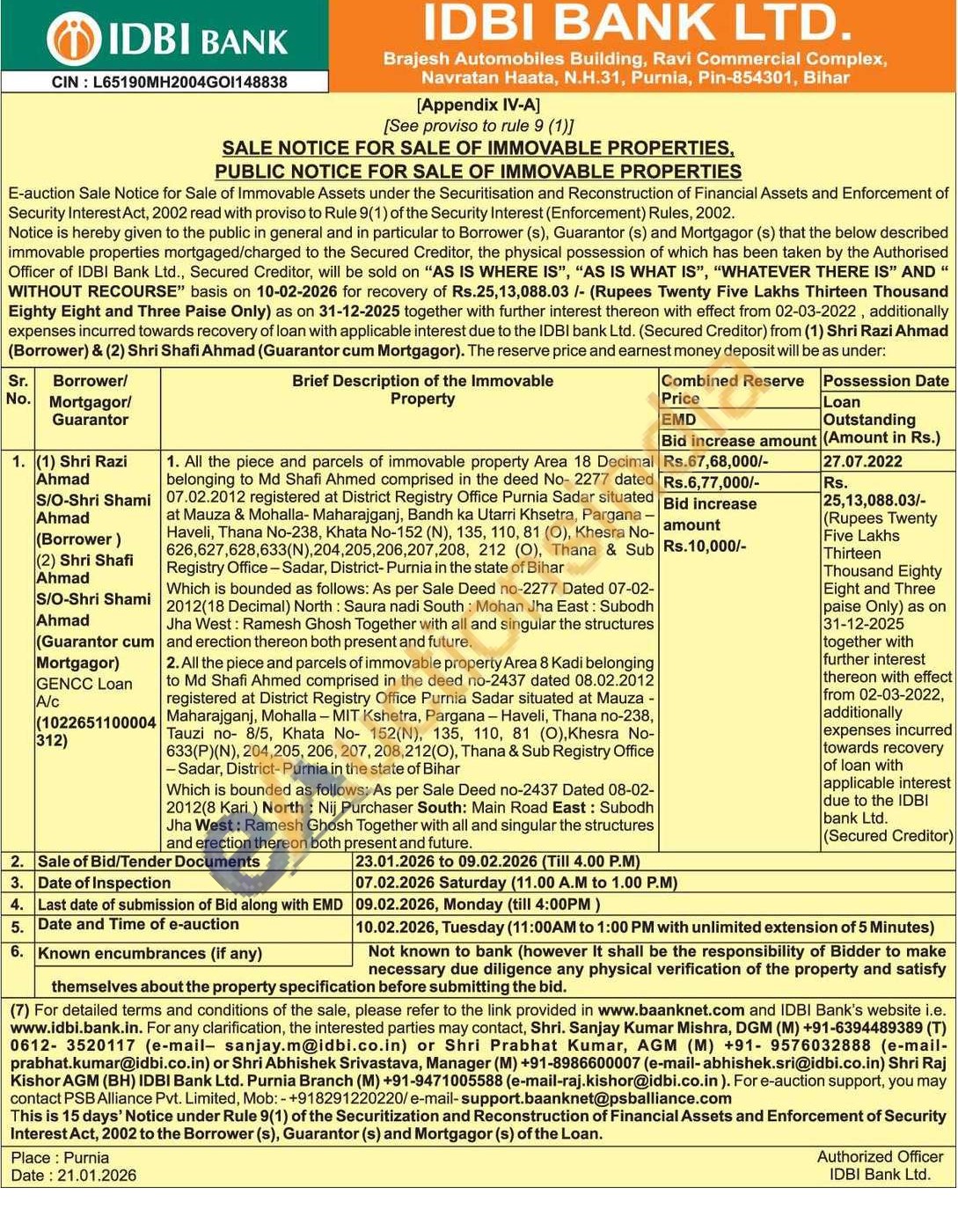 1. All the piece and parcels of immovable property Area 18 Decimal belonging to Md Shafi Ahmed comprised in the deed No- 2277 dated 07.02.2012 registered at District Registry Office Purnia Sadar situated at Mauza & Mohalla- Maharajganj, Bandh ka Utarri Khsetra, Pargana -Haveli, Thana No-238, Khata No-152 (N), 135, 110, 81 (O), Khesra No-626,627,628,633(N),204,205,206,207,208, 212 (O), Thana & Sub Registry Office-Sadar, District-Purnia in the state of Bihar Which is bounded as follows: As per Sale Deed no-2277 Dated 07-02-2012(18 Decimal) North: Saura nadi South: Mohan Jha East: Subodh Jha West: Ramesh Ghosh Together with all and singular the structures and erection thereon both present and future. 2. All the piece and parcels of immovable property Area 8 Kadi belonging to Md Shafi Ahmed comprised in the deed no-2437 dated 08.02.2012 registered at District Registry Office Purnia Sadar situated at Mauza Maharajganj, Mohalla - MIT Kshetra, Pargana - Haveli, Thana no-238, Tauzi no- 8/5, Khata No- 152(N), 135, 110, 81 (O), Khesra No-633(P)(N), 204,205, 206, 207, 208,212(O), Thana & Sub Registry Office -Sadar, District-Purnia in the state of Bihar Which is bounded as follows: As per Sale Deed no-2437 Dated 08-02-2012(8 Kari) North: Nij Purchaser South: Main Road East: Subodh Jha West: Ramesh Ghosh Together with all and singular the structures and erection thereon both present and future.