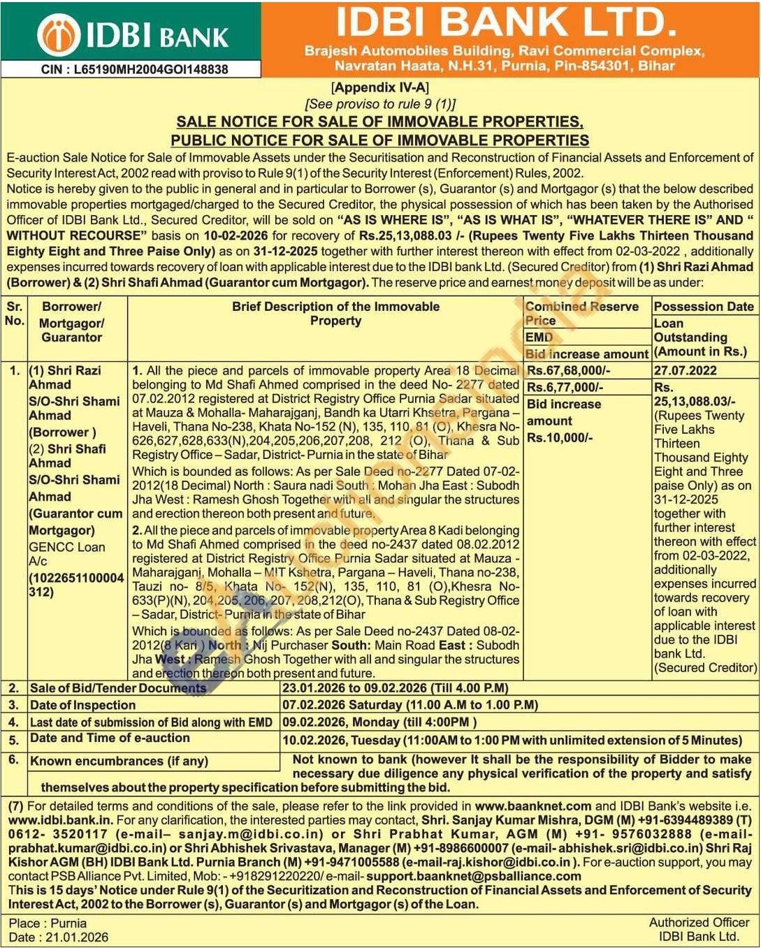 1. All the piece and parcels of immovable property Area 18 Decimal belonging to Md Shafi Ahmed comprised in the deed No-2277 dated 07.02.2012 registered at District Registry Office Purnia Sadar situated at Mauza & Mohalla- Maharajganj, Bandh ka Utarri Khsetra, Pargana -Haveli, Thana No-238, Khata No-152 (N), 135, 110, 81 (O), Khesra No-626,627,628,633(N),204,205,206,207,208, 212 (O), Thana & Sub Registry Office-Sadar, District-Purnia in the state of Bihar
