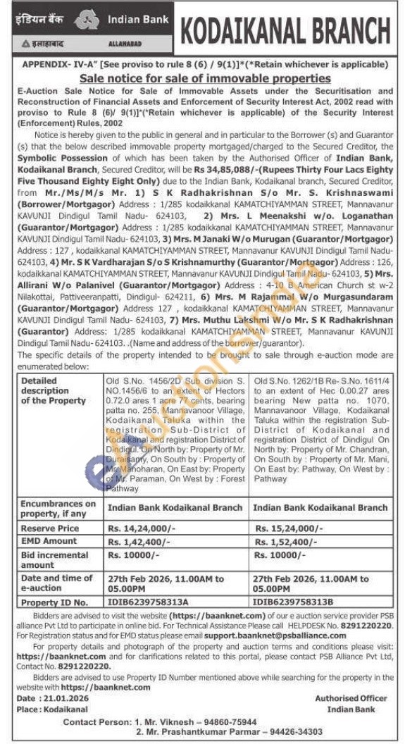 Old S.No. 1262/18 Re-S.No. 1611/4 to an extent of Hec 0.00.27 ares bearing New patta nо. 1070. Mannavanoor Village, Kodaikanal Taluka within the registration Sub-District of Kodaikanal and registration District of Dindigul On North by: Property of Mr. Chandran, On South by Property of Mr. Mani, On East by: Pathway, On West by Pathway