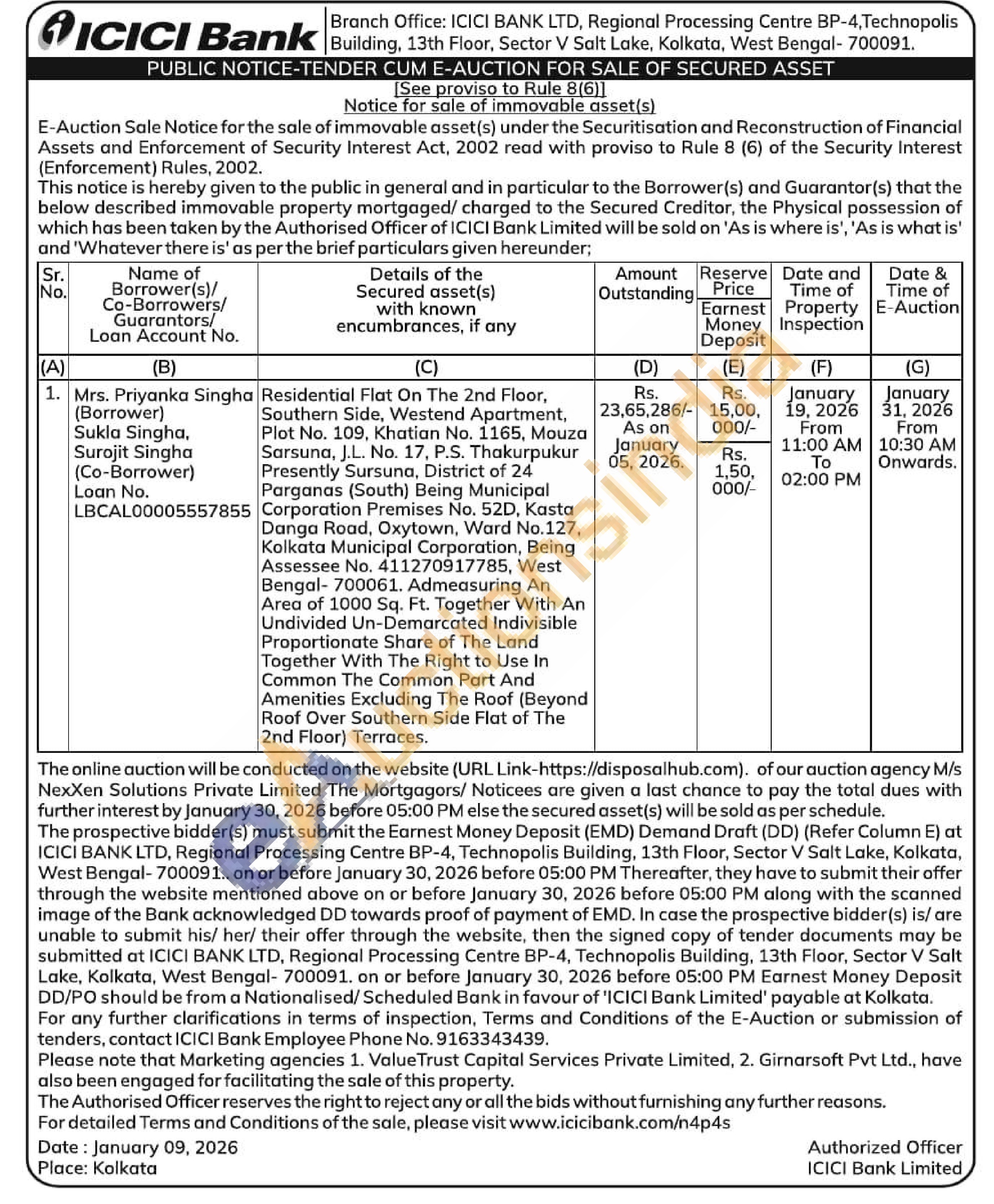 Residential Flat On The 2nd Floor, Southern Side, Westend Apartment, Plot No. 109, Khatian No. 1165, Mouza Sarsuna, J.L. No. 17, P.S. Thakurpukur Presently Sursuna, District of 24 Parganas (South) Being Municipal Corporation Premises No. 52D, Kasta Danga Road, Oxytown, Ward No.127, Kolkata Municipal Corporation, Being Assessee No. 411270917785, West Bengal-700061. Admeasuring An Area of 1000 Sq. Ft. Together With An Undivided Un-Demarcated Indivisible Proportionate Share of The Land Together With The Right to Use In Common The Common Part And Amenities Excluding The Roof (Beyond Roof Over Southern Side Flat of The 2nd Floor) Terraces.Residential Flat On The 2nd Floor, Southern Side, Westend Apartment, Plot No. 109, Khatian No. 1165, Mouza Sarsuna, J.L. No. 17, P.S. Thakurpukur Presently Sursuna, District of 24 Parganas (South) Being Municipal Corporation Premises No. 52D, Kasta Danga Road, Oxytown, Ward No.127, Kolkata Municipal Corporation, Being Assessee No. 411270917785, West Bengal-700061. Admeasuring An Area of 1000 Sq. Ft. Together With An Undivided Un-Demarcated Indivisible Proportionate Share of The Land Together With The Right to Use In Common The Common Part And Amenities Excluding The Roof (Beyond Roof Over Southern Side Flat of The 2nd Floor) Terraces.