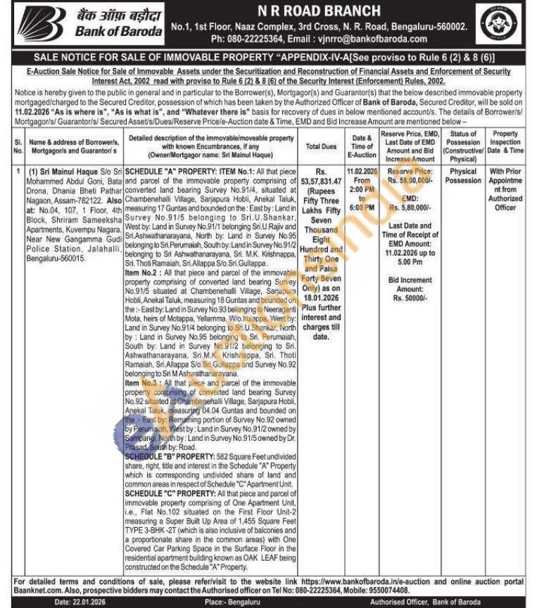 SCHEDULE "A" PROPERTY: ITEM No.1: All that piece and parcel of the immovable property comprising of converted land bearing Survey No.91/4, situated at Chambenehalli Village, Sarjapura Hobli, Anekal Taluk, measuring 17 Guntas and bounded on the: East by: Land in Survey No.91/5 belonging to Sri.U.Shankar, , West by: Land in Survey No.91/1 belonging Sn.U. Rajiv and Sri Ashwathanarayana, North by: Land in Survey No.95 belonging to Sri. Perumaiah, South by: Land in Survey No.91/2 belonging to Sri Ashwathanarayana, Sri. M.K. Krishnappa, Sri. Thoti Ramaiah, Sri. Allappa S/o.Sri. Gullappa.